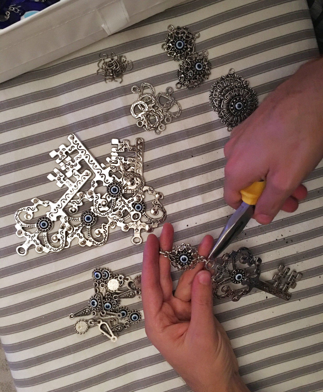 We collect special figure of metals as crafts & supplies. They are like elephant, fish, owl, hamsa hand, keychain, caftan, horse, horseshoe etc. They are the main parts of our wall hangings. We combine these main parts with different sizes of glass evil eyes and finalize them with wall hangers & small special metal connectors.