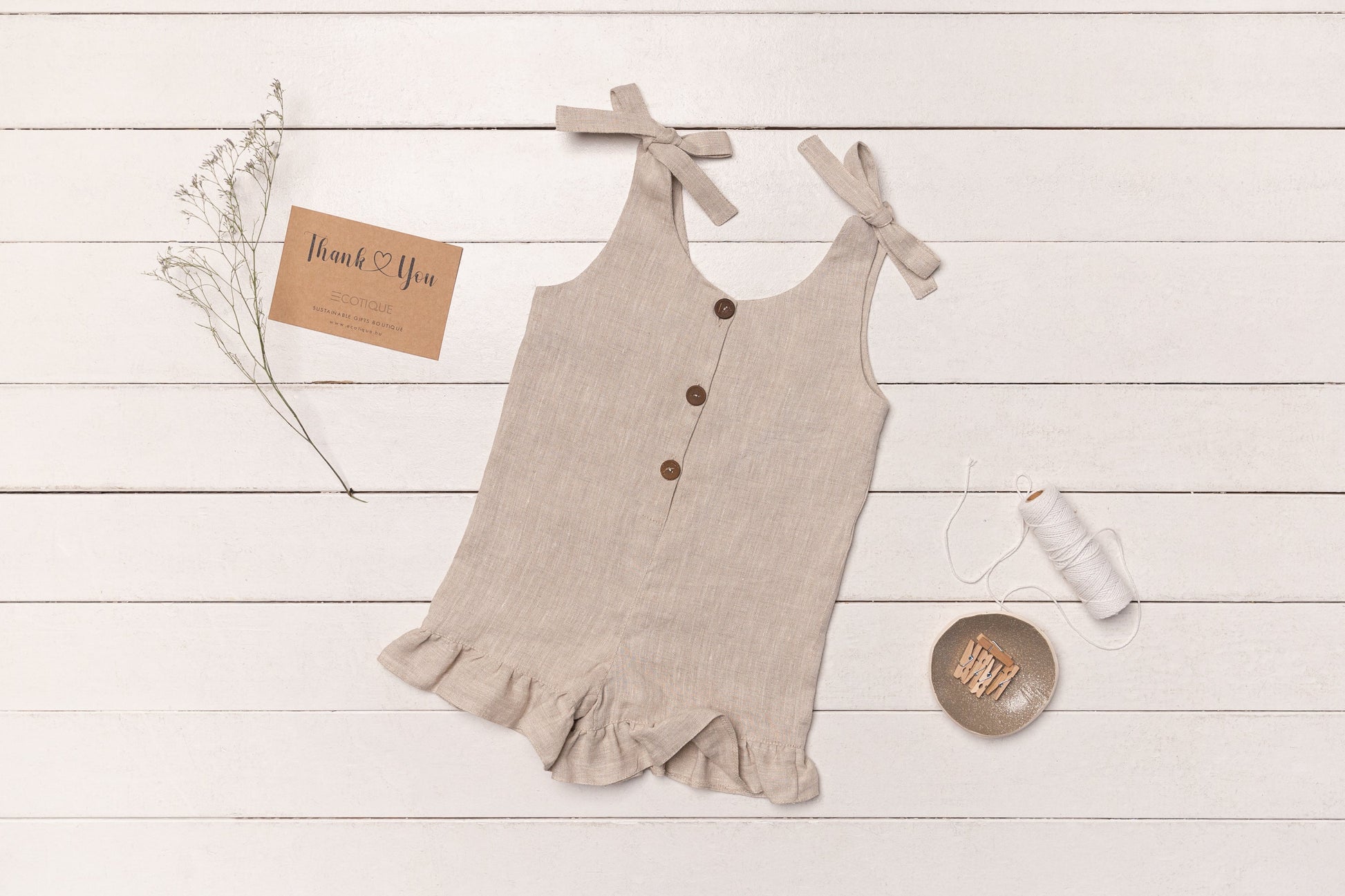 The Linen Romper features unique coconut buttons on the chest and adjustable ties on the shoulders, ensuring a perfect fit. Delicate ruffle details add a touch of whimsy to this simple and elegant design.